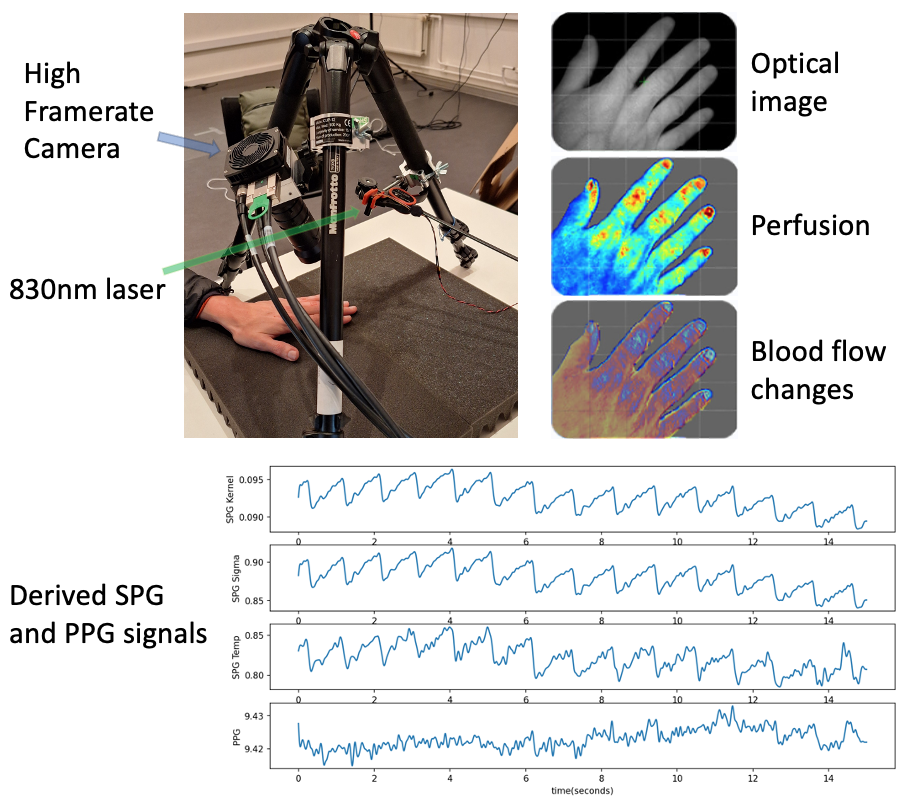 IMEC has recently introduced a novel concept of High-Framerate Speckle Imaging, where laser speckle patterns are recorded with high-framerate camera, taking 3000 framed per second (fps) in full HD resolution, as opposed to 30 fps in conventional LSCI. High-framerate imaging allows us to capture vital signals (such as parts of cardiac cycles, local tissue perfusion and oxygenation changes, blood velocity, etc.) with high signal quality above current state of the art (PPG). In addition, very fast changes and functions of tissue to explore extraction of additional information: a) separation if vessel wall motion from blood flow velocity, b) analysis of viscoelastic behavior and c) to quantify absorption and scattering properties of tissue. High image resolution allows us to simultaneously compare multiple tissue types and to localize the analysis on each tissue type separately. Laparoscopic surgery is one of the cases that could benefit from HFSI. The success of laparoscopic surgical procedures depends to a great extent on good tissue oxygenation (anastomotic leakage, which occurs in approximately 1 of 6 patients and carries up to 28% mortality rate) and the existing techniques are not able to assess whole tissue oxygenation and function during surgery. Perfusion and functional imaging prove critical in surgeries involving blood vessel manipulation such as Coronary Artery Bypass Grafting (CABG) and oxygenation measurements can accurately detect death heart tissue, which is all achievable in a non-invasive way using HFSI, unlike the current state-of-the-art methods which are invasive and cumbersome.