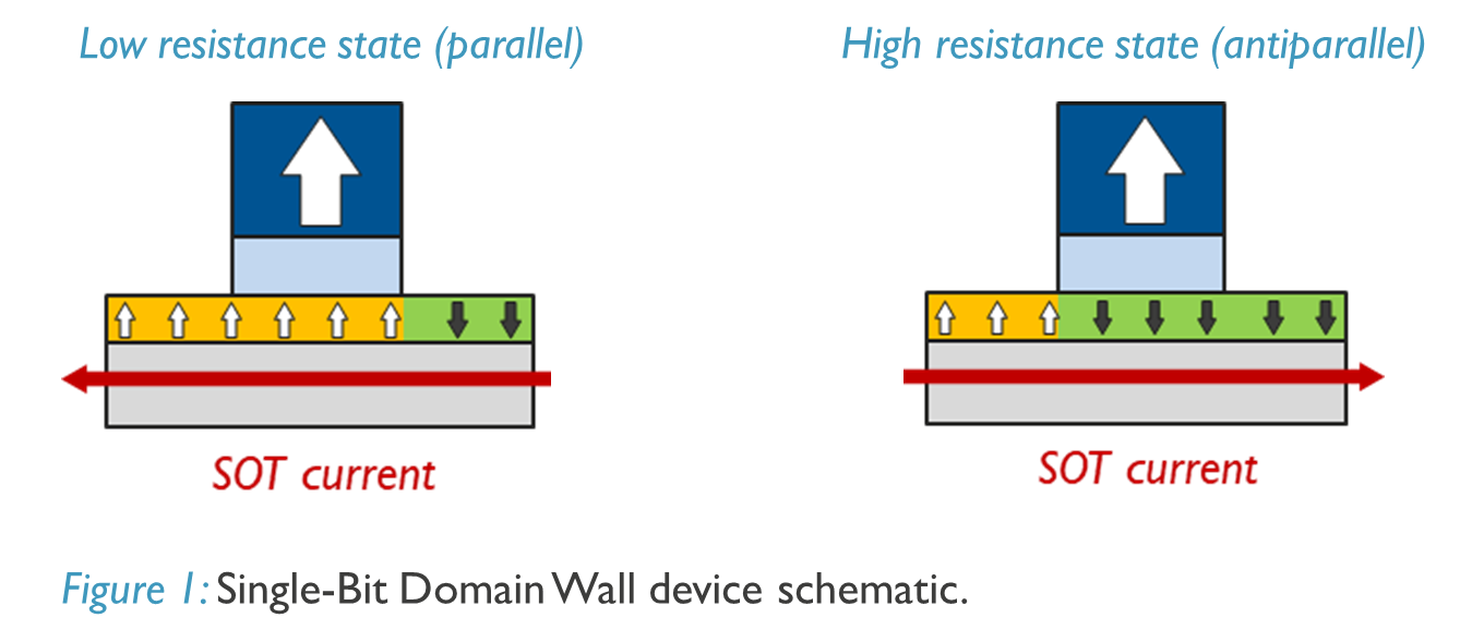To overcome these issues, single-bit domain wall (DW) devices have been proposed. In these devices, the storage layer extends beyond the MTJ with information encoded by the position of a DW within this extended region [1]. Placing the DW at either edge of the MTJ leads to a distinct resistance state, thereby representing the two binary states (Fig. 1). The device is promising to reduce switching current, since moving a DW requires an order of magnitude less current than switching the full free layer, as in conventional SOT-MRAM devices. Furthermore, DW devices do not rely on an external magnetic field, providing a field-free alternative with improved scalability.
