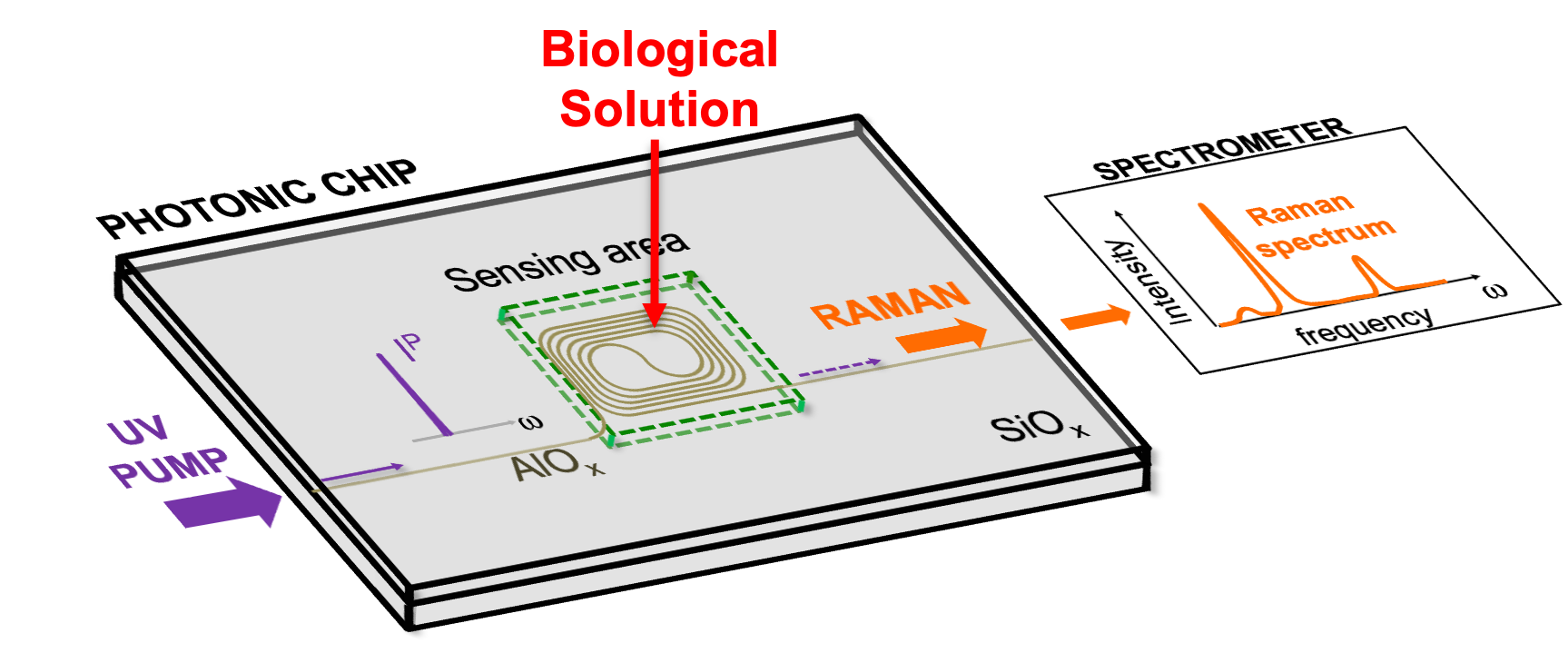 In this project, we will design, fabricate, and characterize integrated photonic circuits based on alumina, leveraging its broad spectral transparency from UV to NIR. We will investigate the intrinsic Raman response of these circuits across both spectral regions and implement on-chip Raman sensing of biomolecules. By comparing sensor performance across multiple wavelengths, we aim to exploit the advantages of a multispectral platform. Our goal is to achieve record-breaking detection limits and establish new paradigms for on-chip Raman spectroscopy.